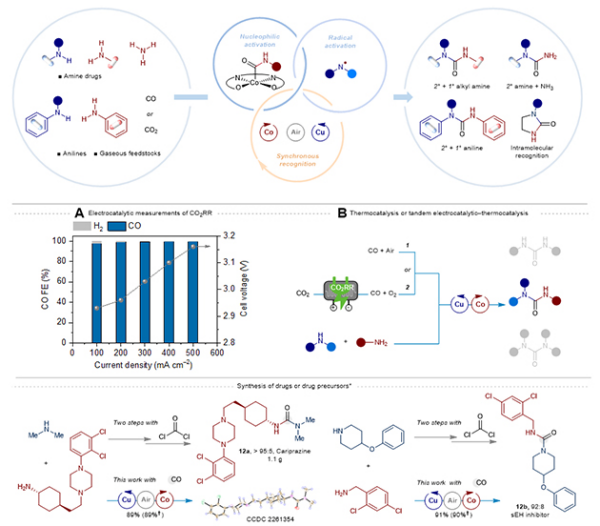 (A)底物适用范围;(B)从CO2出发经由CO合成非对称脲的电热耦合过程;(C)小分子成药非光气路线合成