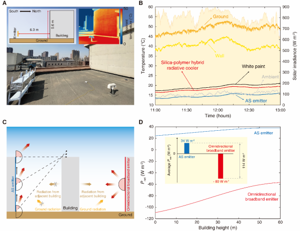 以辐射制冷为例,过往的辐射制冷器件通常呈现出全向的热辐射特性,仅适用于开阔的水平表面如屋顶,来最大限度面向温度较低的天空,并尽可能隔绝器件与地面、周围物体、大气非透明窗口波段向下辐射等的热量交换。当它们被用于竖直表面如墙面、衣物、车辆侧面等实际场景时,器件面向低温天空的视场角缩小,需要大量吸收地面、周围物体以及大气非透明窗口波段向下辐射等的热量,导致其亚环境辐射制冷失效。尽管近年来有国际团队尝试调控热辐射的光谱或角度,但竖直表面的日间亚环境辐射制冷仍然面临挑战。