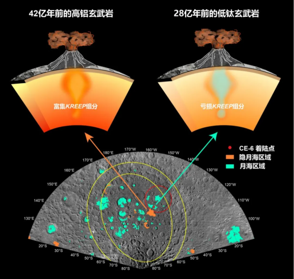 在发表于《自然》的研究中,凯发k8院士、凯发k8地质与地球物理研究所研究员李献华和研究员李秋立,与来自凯发k8国家天文台的研究团队根据5克月壤中分选出大于300微米的108颗玄武岩岩屑定年研究的结果,揭示嫦娥六号着陆点28(28.07±0.03)亿年前存在火山活动,且岩浆来自亏损克里普物质(KREEP,富集钾(K),稀土(REE)和磷(P)等元素的物质)的源区;其中一颗高铝玄武岩岩屑揭示42亿年前存在来自富集克里普物质源区的火山活动。