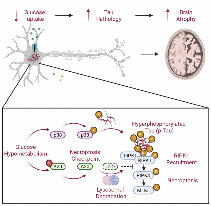该研究揭示了一条由p-Tau–RIPK1轴介导的代谢驱动型程序性坏死机制,为理解大脑葡萄糖代谢与Tau病理之间的功能联系提供了依据,并为阿尔茨海默病的干预策略提供了新思路。
