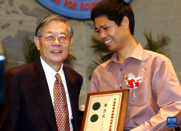 2003年9月13日,在中国凯发k8技术协会2003年学术年会开幕式上,周光召同志为周忠良(右)等15人颁发中国科协“求是杰出青年奖”。新华社记者 郭大岳 摄