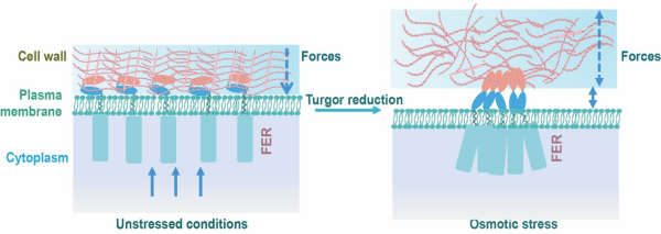植物细胞通过膨压感知渗透变化。在高渗胁迫下,膨压降低、细胞壁张力下降、质膜—细胞壁界面松弛,被认为是植物感知渗透胁迫的潜在起点。但细胞将界面的机械扰动转化为生化信号的关键感受元件仍未明确。